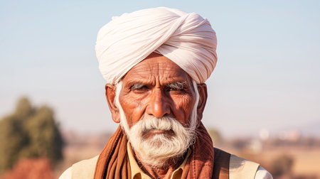 Elderly man with mustache and traditional Rajasthani turban smiling to camera