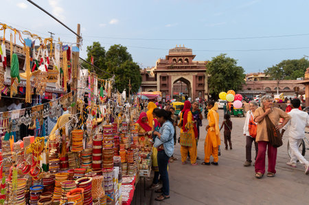 Jodhpur, Rajasthan, India - 20.10.2019 : Beautiful Rajasthani Bangles being sold at famous Sardar Market and Ghanta ghar Clock tower in Jodhpur, Rajasthan, India.