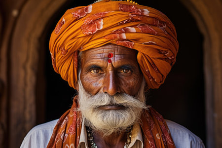 HARIDWAR, INDIA - NOVEMBER 04, 2018: Portrait of Rajasthani man wearing traditional dress and turban on street local market, Haridwar, India, close up