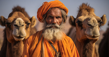 PUSHKAR, INDIA - NOVEMBER 14, 2018: Indian man in the desert Thar during Pushkar Camel Mela near holy city Pushkar, Rajasthan, India. This fair is the largest camel trading fair in the world.