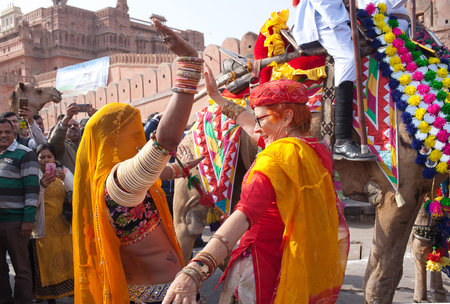 BIKANER, INDIA - JANUARY 12, 2019: People dancind on the street during festival in Rajasthan state. Camel Festival begins with a colourful procession of camels, musicians and dancers