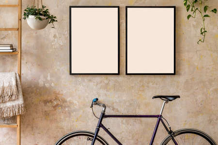 Interior design of living room with two black poster mock up frames, bike and potted plants. Grunge wabi sabi wall. Stylish hipster home decor. Template.