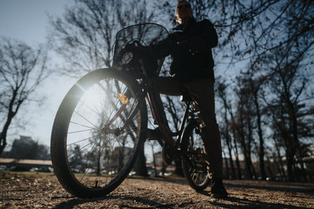 Silhouette of an elderly man leisurely cycling on a pathway in a park, with sunlight filtering through the bicycle wheel.