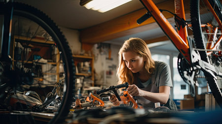 Portrait of concentrated female mechanic repairing bicycle at home in room.