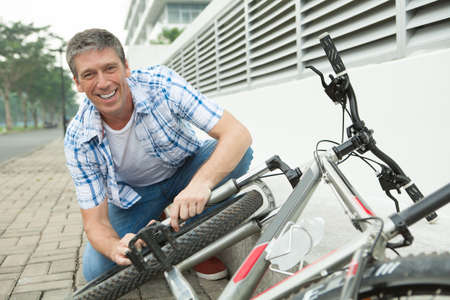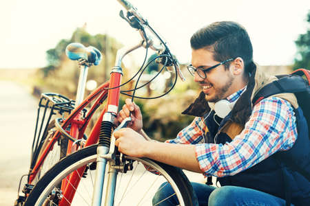 Young man repairing a bicycle in the city. Bicycle repair concept.