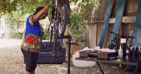 Dedicated female cyclist arranging bicycle tools from specialized toolbox for maintenance and repairs. African american woman assembling professional equipment on bike repair-stand.