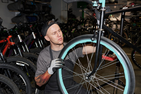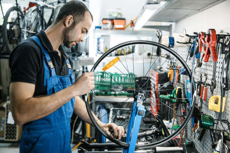 Cycling technician repairing and maintaining bike and wheel in workshop