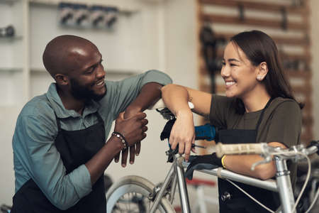 I fixed it faster this time. Shot of two young business owners standing together in their bicycle shop during the day.