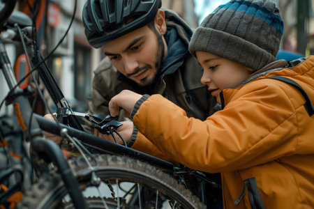 Father wearing a helmet and a son in an orange jacket working together to repair a bicycle outdoors on a city street