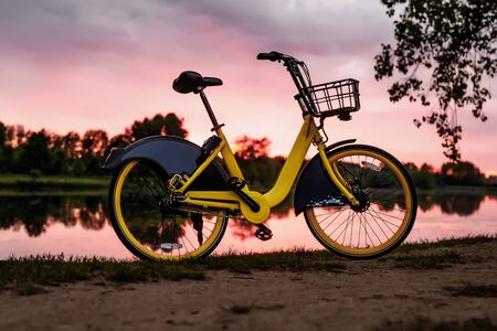 Yellow bike on the lake. Sunset pink sky