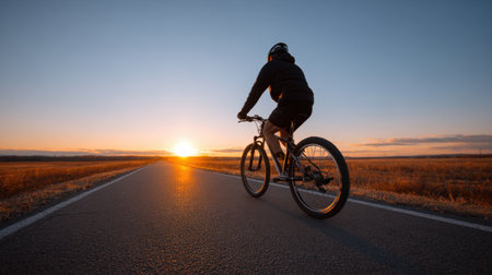 A cyclist rides along an empty road during a vibrant sunset, capturing a moment of adventure and serenity in a beautiful open landscape.