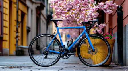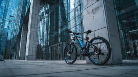 An electric bicycle is parked near a sleek modern building, showing an eco-friendly lifestyle in a vibrant urban setting.