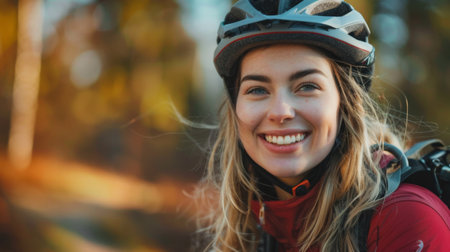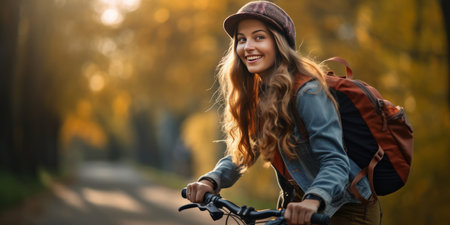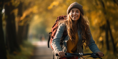 Joyful woman cycling in autumn park, radiant in sunlight, enjoying a serene ride through a colorful forest. AI generative.