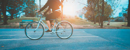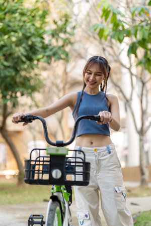 Happy young asian woman in casual clothes enjoy riding bicycle at the park for recreation