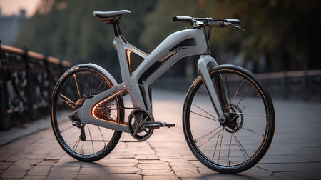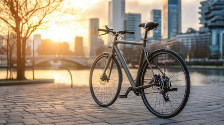 A modern bicycle stands gracefully by the riverbank during a vibrant sunset, showcasing urban life, tranquility, and the joy of outdoor cycling adventures.