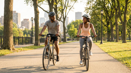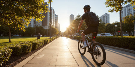 Cycling for Health and Sustainability A cyclist riding through a sunlit park, effortlessly gliding along a scenic bike path with nature