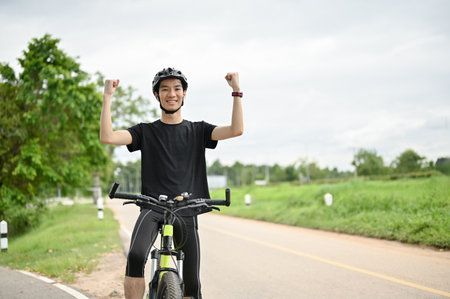 A happy Asian man in sportswear and a bike helmet raises his hands on his bike, ready to bike or achieve his cycling goal. cheering up or celebrating gesture