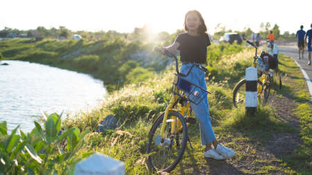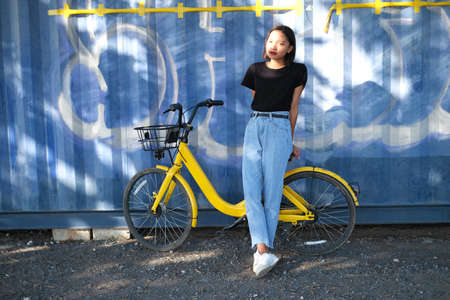 Portrait Asian young girl wear jean and black shirt with yellow bicycle.