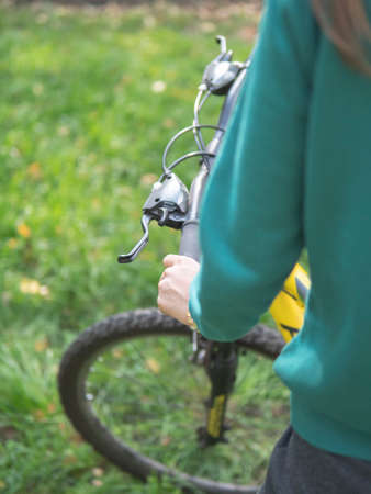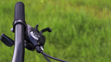 Mountain bike steering wheel on green grass background. Details of sporting events. Close up black mountain bike knob and derailleur knob, left shifter