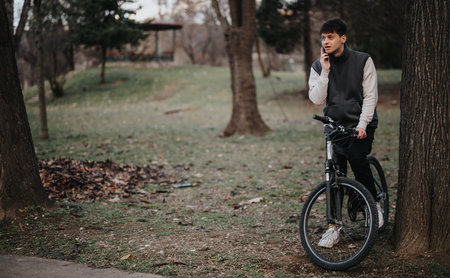 Teenage boy with bicycle talking on phone in park setting