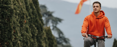 Young man in a red hoodie riding a bicycle in the park on a cloudy day