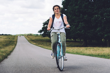 Smiling pretty young woman riding bike in a country road in the park