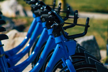 Reims France September 18, 2020 View of accessible bicycles to hire for short periods of time, usually for a few hours parked in the historical street and part of the public transport system of Reims