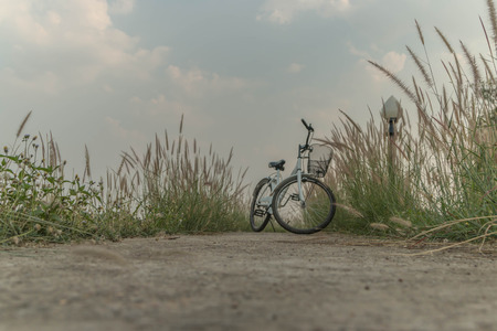 Bicycle near lake during sunset.Vintage bike near the lake in the evening, warm sunset view.