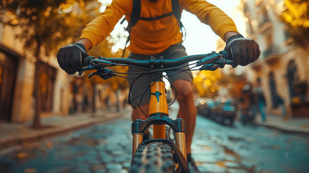 Two hand on bike handlebar. Motion blurred background. Generative AI illustration