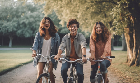 Nothing but friends and road ahead Group of young people riding bicycles along a road and looking happy : Generative AI