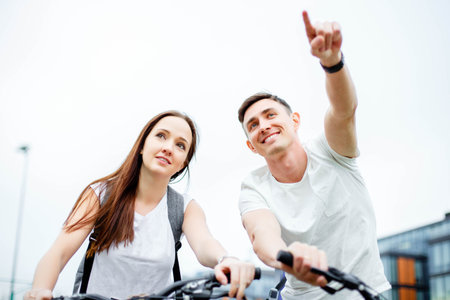 Young man shows his girlfriend route. Bicycle trip.