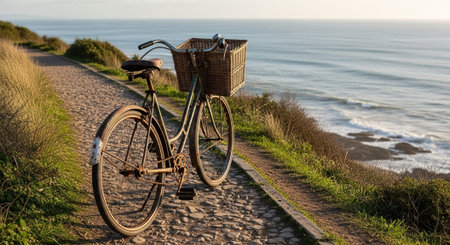 A beautiful scene featuring a bicycle on a wooden pathway leading to a serene ocean view. The lush greenery and blue sky create a perfect backdrop for outdoor adventures.