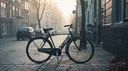 A black bike sits at the end of a quiet street, surrounded by urban stillness, evoking a sense of solitude and urban contemplation