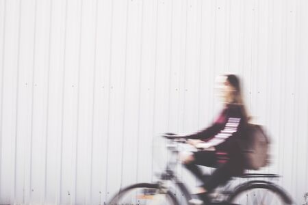 man with rucksack on bike in blurred motion