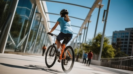 A Slender girl on a bike pedals a bicycle on the Tilikum Crossing Bridge preferring an active healthy lifestyle using cycling ride and cycle as an alternative environmentally friendly transportation
