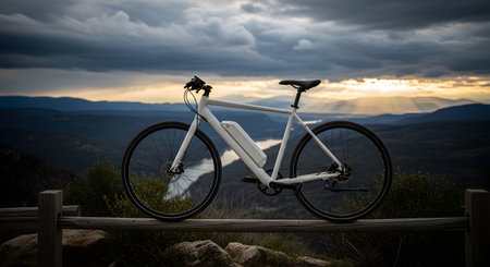 A sleek, white electric bicycle rests on a wooden railing, overlooking a vast mountain landscape during a dramatic sunset.