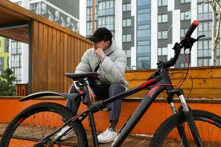 A man in a cap and a warm jacket enjoys a walk with a bicycle in the city