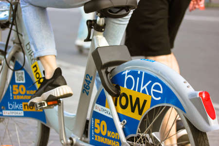 Kyiv, Ukraine. 7 May, 2020. A girl riding renting bike pedaling. Ukrainian bike rental service Bike now with blue yellow logo. Bike now company from Kiev city in Eastern Europe. Urban transportation.