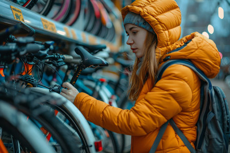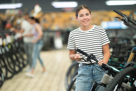 Young Woman Choosing Bike in Cycle Store. Urban Commuting, Sustainable Transportation.