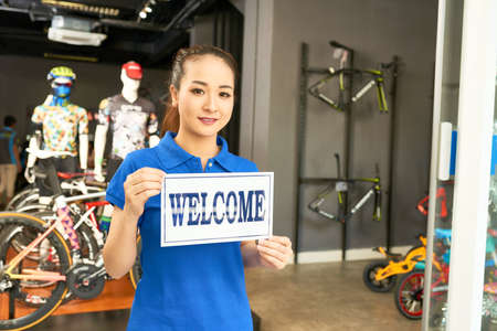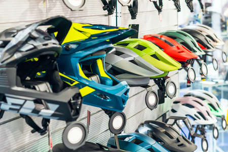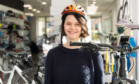 Portrait of young woman choosing bicycle helmet in sport shop. Focus on helmet