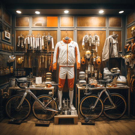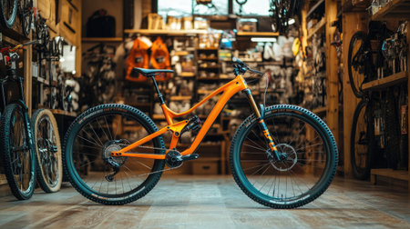 A vibrant orange mountain bike elegantly displayed in a bike shop interior, showcasing cycling equipment and highlighting the sport's adventurous spirit. Perfect for enthusiasts!