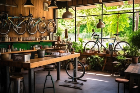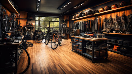 inside traditional bicycle repair shop with stuff and equipment professional photography
