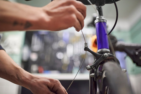 Unrecognizable man assembling the brake system of a bicycle as part of the maintenance service he performs in his shop. Real people at work.