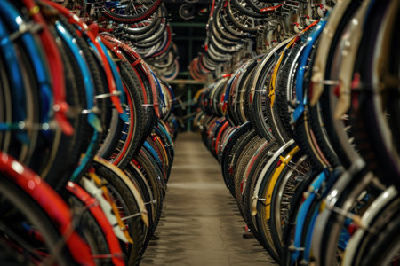 Aisles of colorful bicycles neatly lined up in a store, showcasing wheels and frames in an organized display.