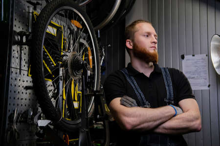 Portrait of a handsome redhead male with beard and haircut wearing jeans coverall, standing near bicycle wheel in a workshop against wall tools.
