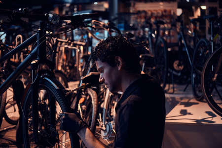 shot of a young man looking at a bicycle in his repair shop, created with generative ai
