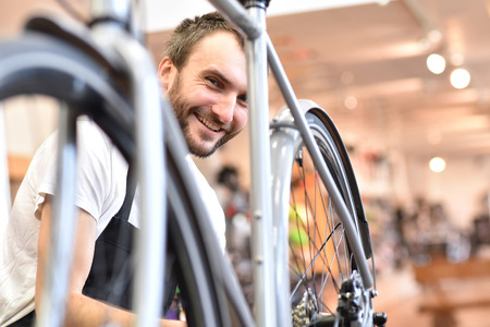 friendly and competent bicycle mechanic in a workshop repairs a bike