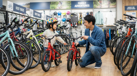 Father and son buying bicycles in a store. Family shopping in a bicycle store