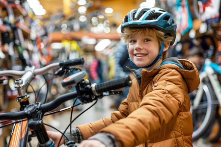 Young boy is smiling while choosing a new bicycle in a bike shop, excited to start riding