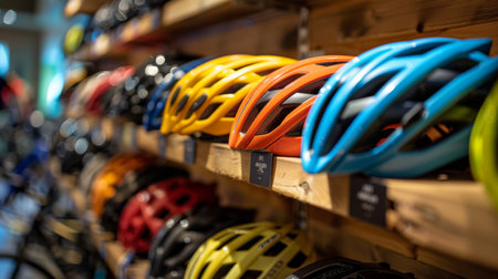 Colorful Selection of Cycling Helmets Displayed on Wooden Shelves in a Retail Store Focused on Biking Accessories During Daylight Hours. Generative AI